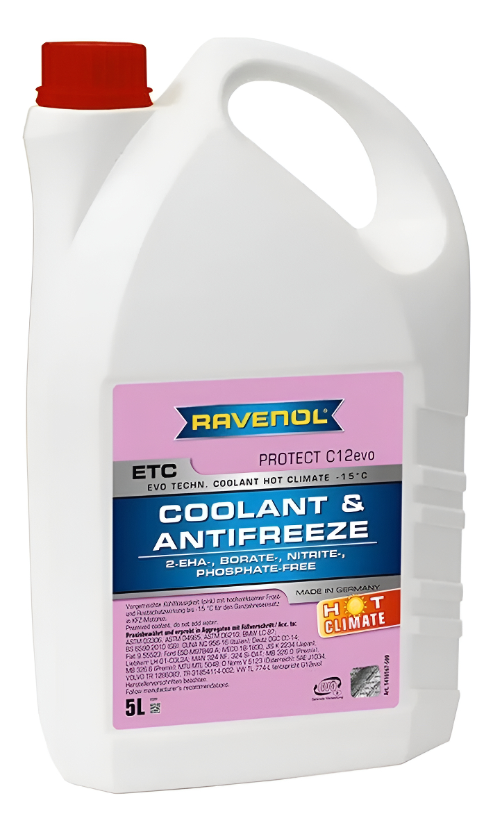 RAVENOL ETC Hot Climate -15°C Protect C12evo es un refrigerante premezclado con protección contra las heladas y la corrosión para uso durante todo el año en motores de automóviles. Incluso en verano, el refrigerante debe contener suficiente anticongelante para garantizar una buena protección contra la corrosión y el sobrecalentamiento.